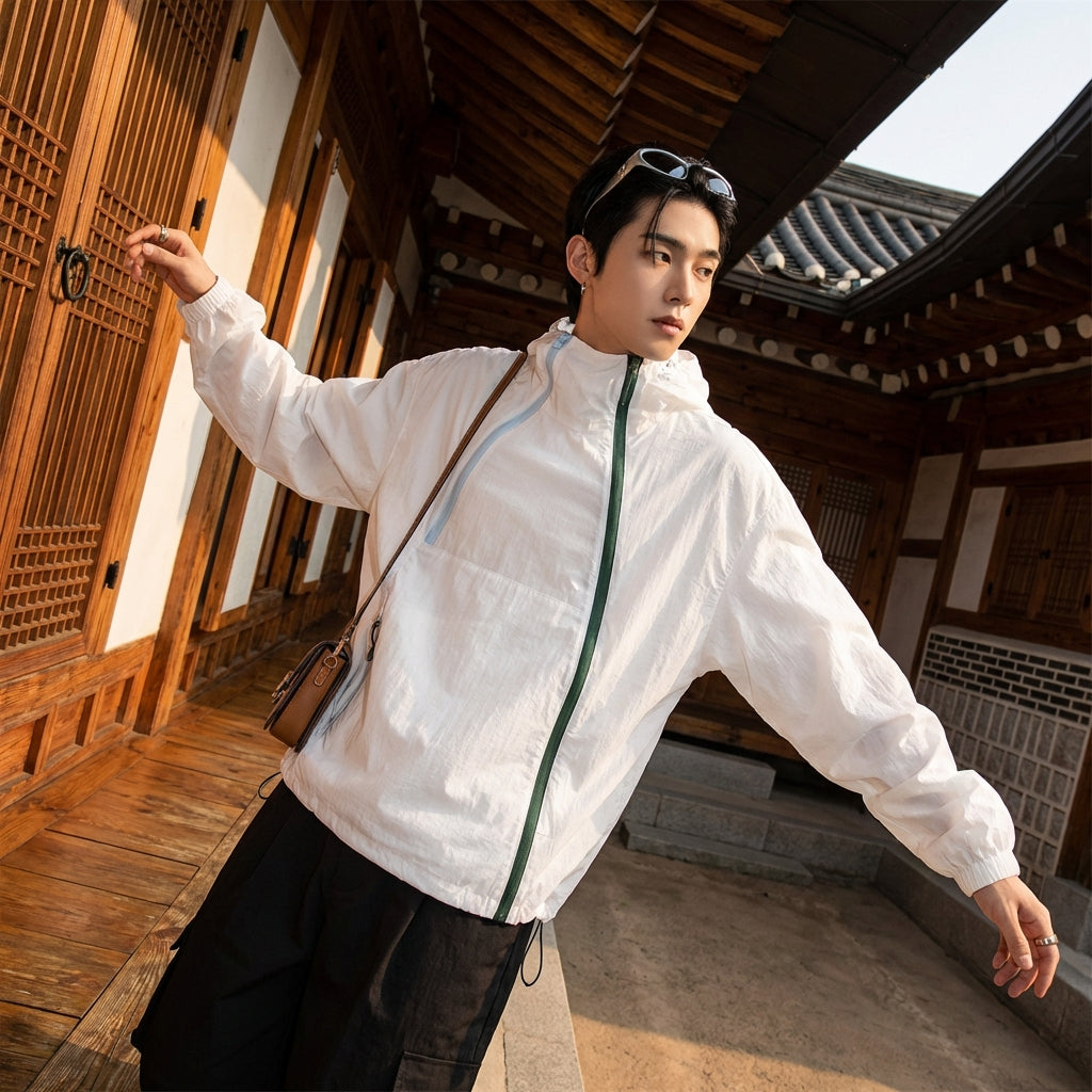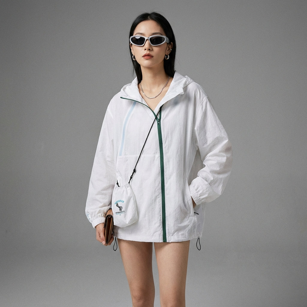 Adopta un look moderno y casual con nuestra chaqueta ligera con capucha, que cuenta con una cremallera asimétrica y bolsillos grandes. ¡Perfecta para una elegante protección solar o para complementar tu atuendo urbano! ☀️