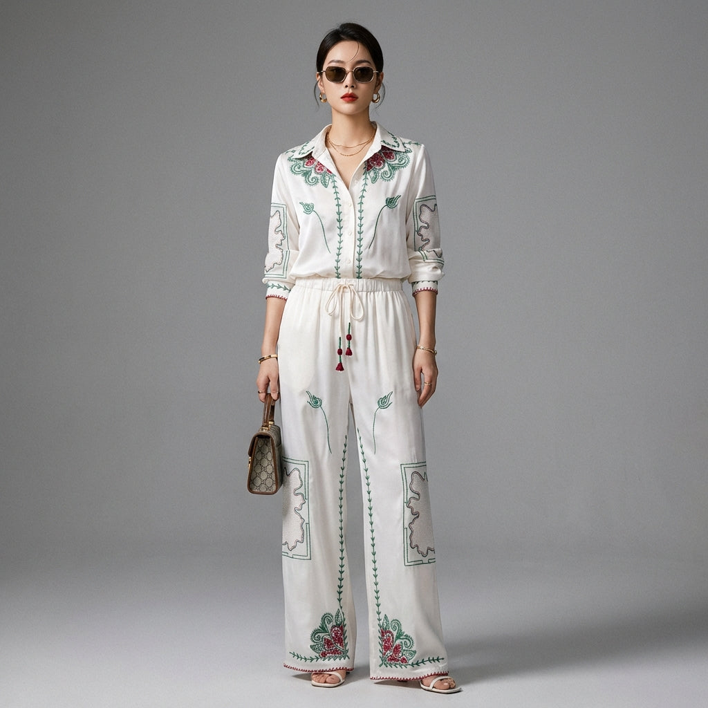 Descubre nuestro elegante conjunto de camisa y pantalón de satén, perfecto para un look casual pero sofisticado. La camisa de manga larga presenta un patrón refinado, mientras que el pantalón a juego de talle alto ofrece una silueta fluida y cómoda. ¡Ideal para quienes buscan un atuendo moderno y fácil de llevar! ✨