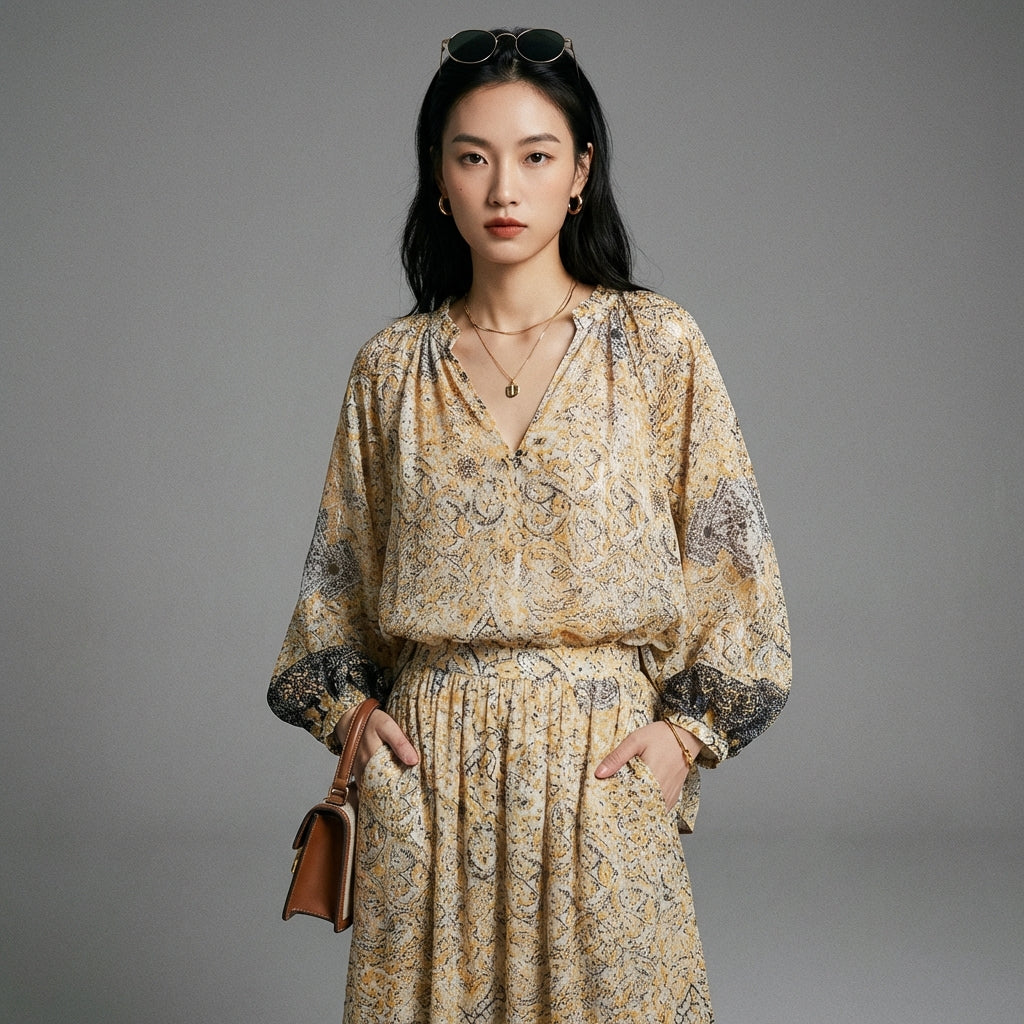 Descubre nuestro conjunto chic y moderno, compuesto por una camisa de manga larga y una falda midi, ambos adornados con estampados. Diseñado para quienes aman combinar comodidad y estilo, ¡este conjunto es perfecto para afirmar tu personalidad con elegancia! ✨