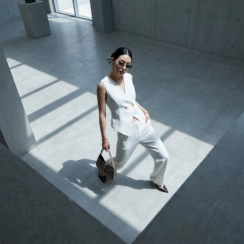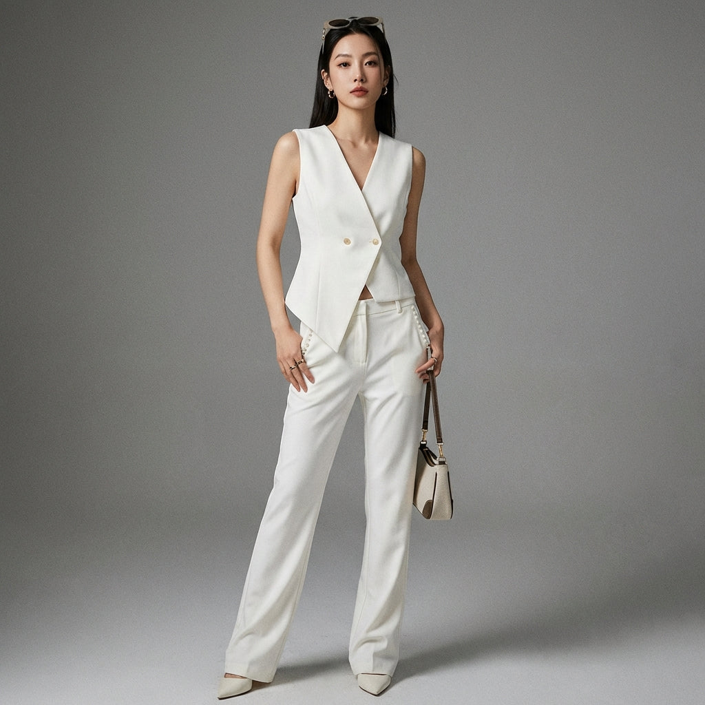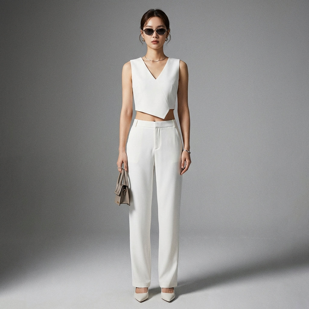 Descubre nuestro conjunto chic y moderno, compuesto por un crop top asimétrico sin mangas con un elegante cuello en V y un pantalón largo informal de talle bajo. ¡Perfecto para un look moderno y atrevido! ✨