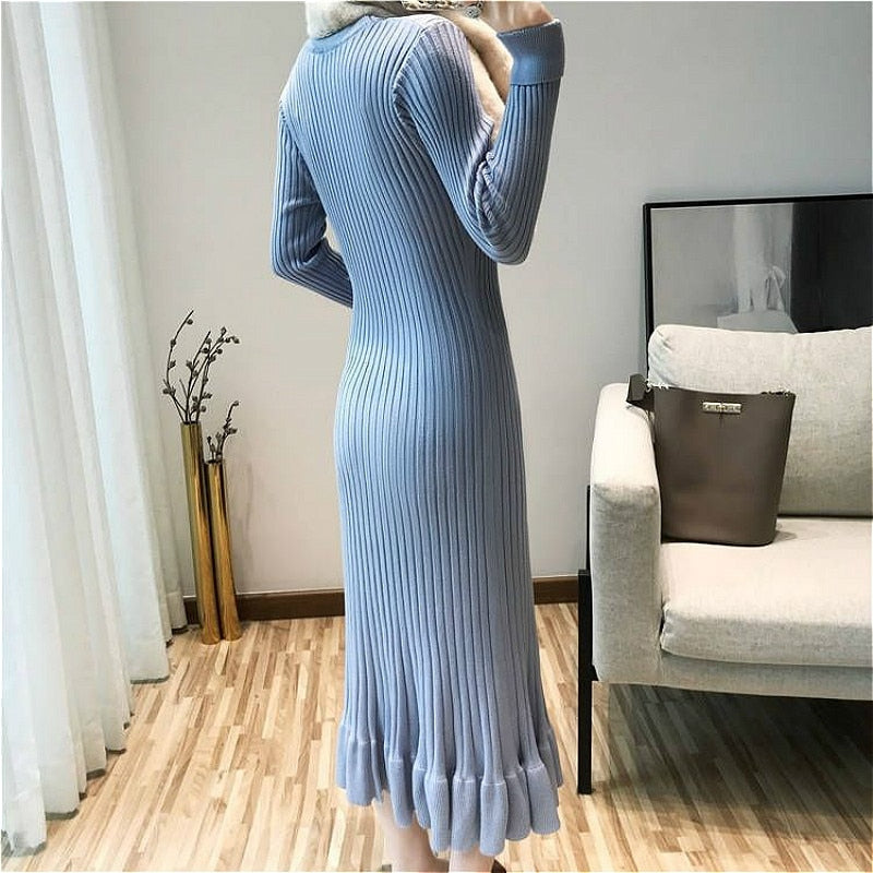 Este vestido largo es un modelo elegante ideal para ir a trabajar a Corea del Sur. Es de punto, lo que permite abrigarse. Es un vestido femenino, flexible y resistente. Es muy agradable y las mangas son largas.