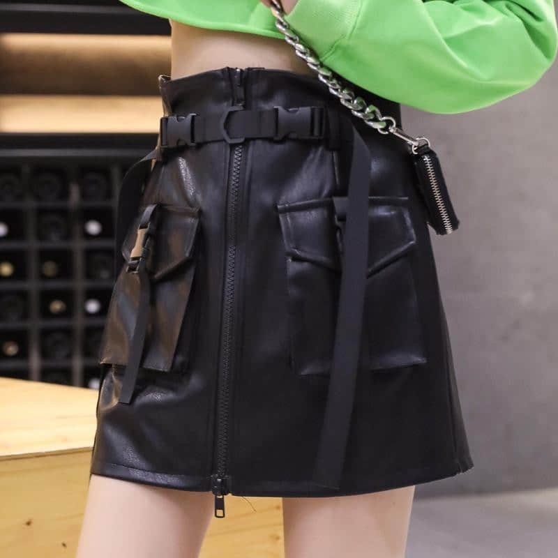 Si te gusta el streetwear y la ropa de nueva generación, esta Falda Efecto Cuero Streetwear te encantará. Lleva una falda con un diseño agresivo, clips y dos bolsillos.