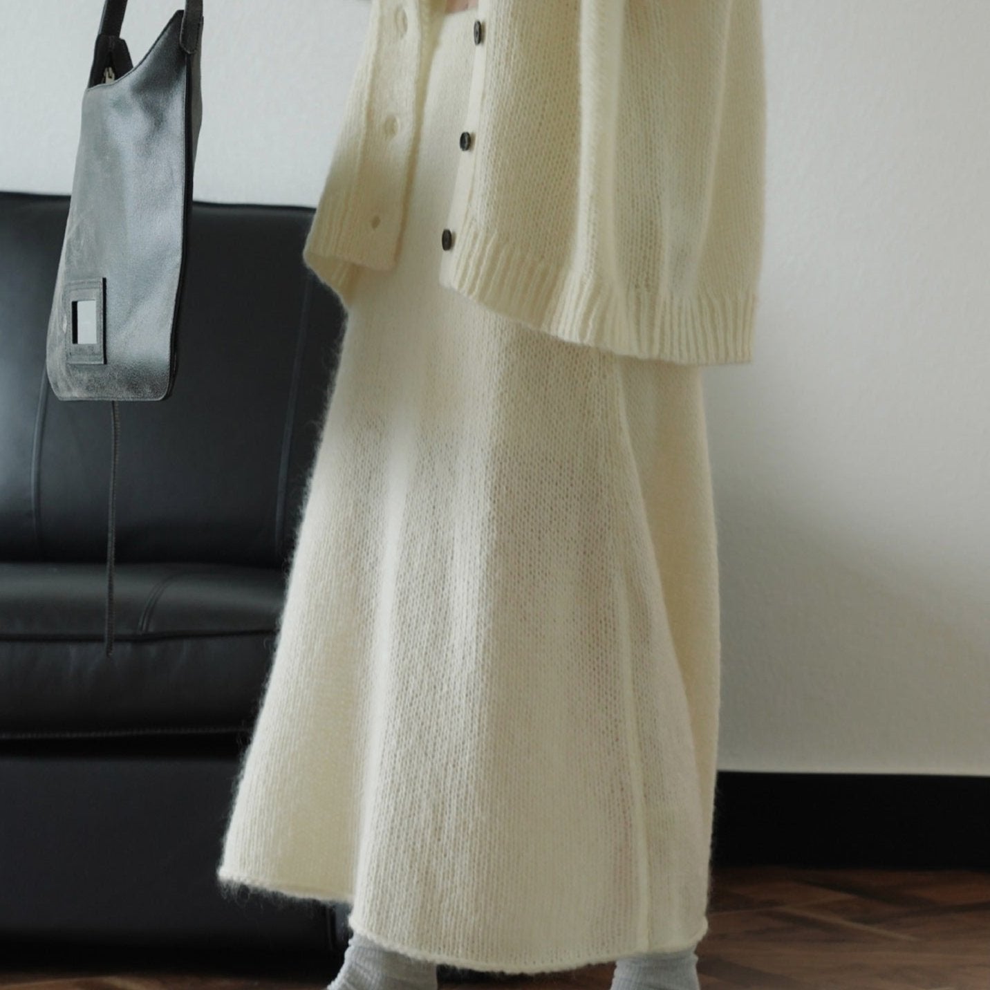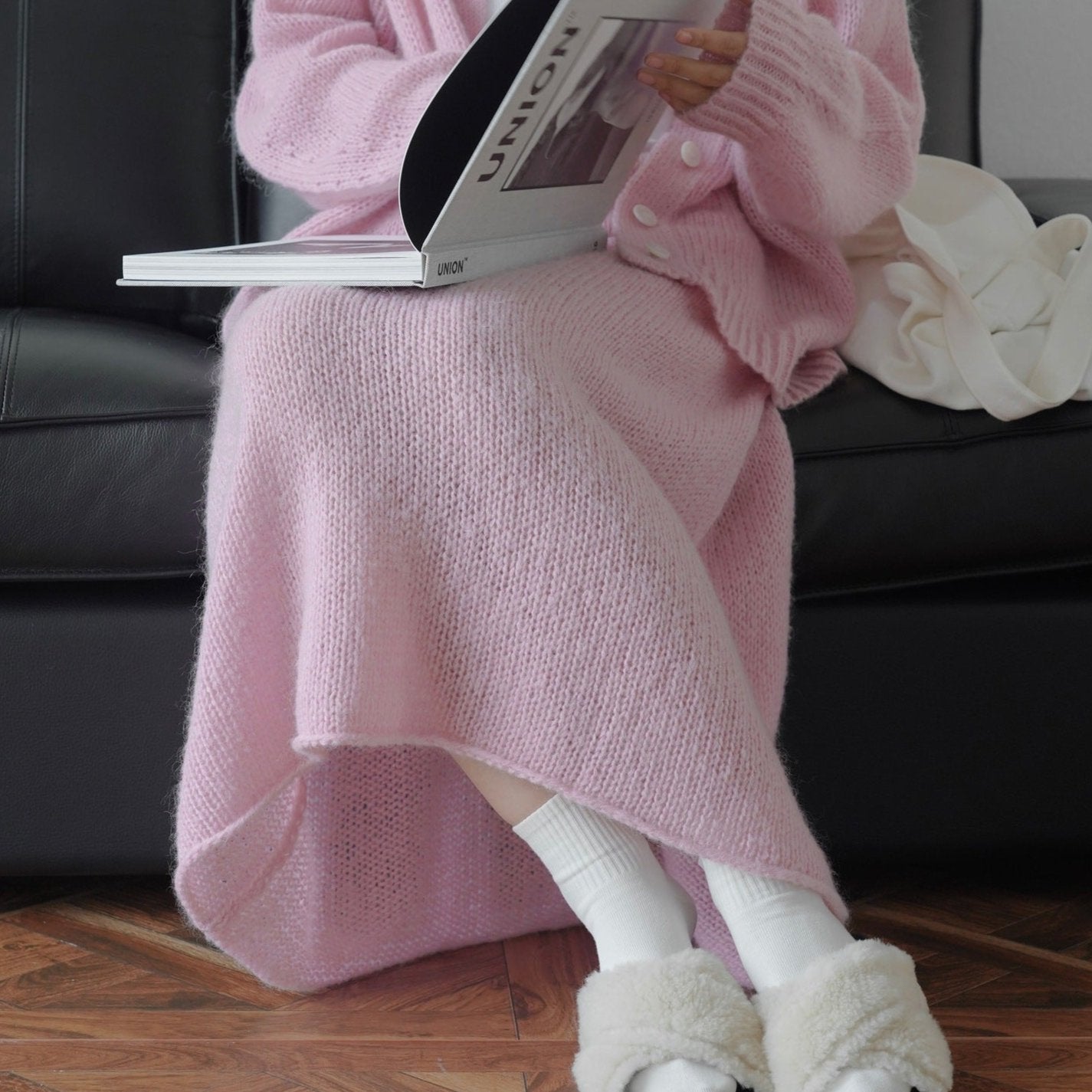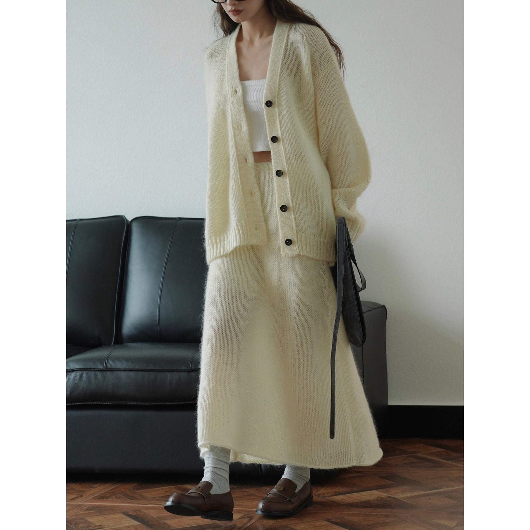Elige esta falda larga de mohair para añadir una prenda versátil y chic a tu guardarropa, adoptando la moda coreana.