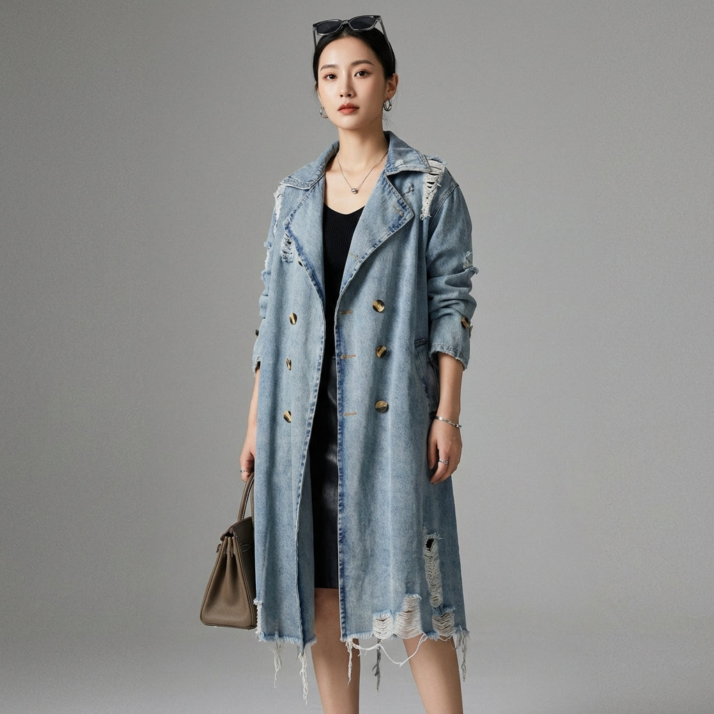 Afirma tu estilo con nuestra gabardina larga de mezclilla, una prenda audaz y moderna. Con un elegante cuello de solapa y mangas largas, este abrigo cruzado ofrece una silueta sofisticada con un toque casual y moderno. ¡Perfecto para quienes aman destacar! ✨