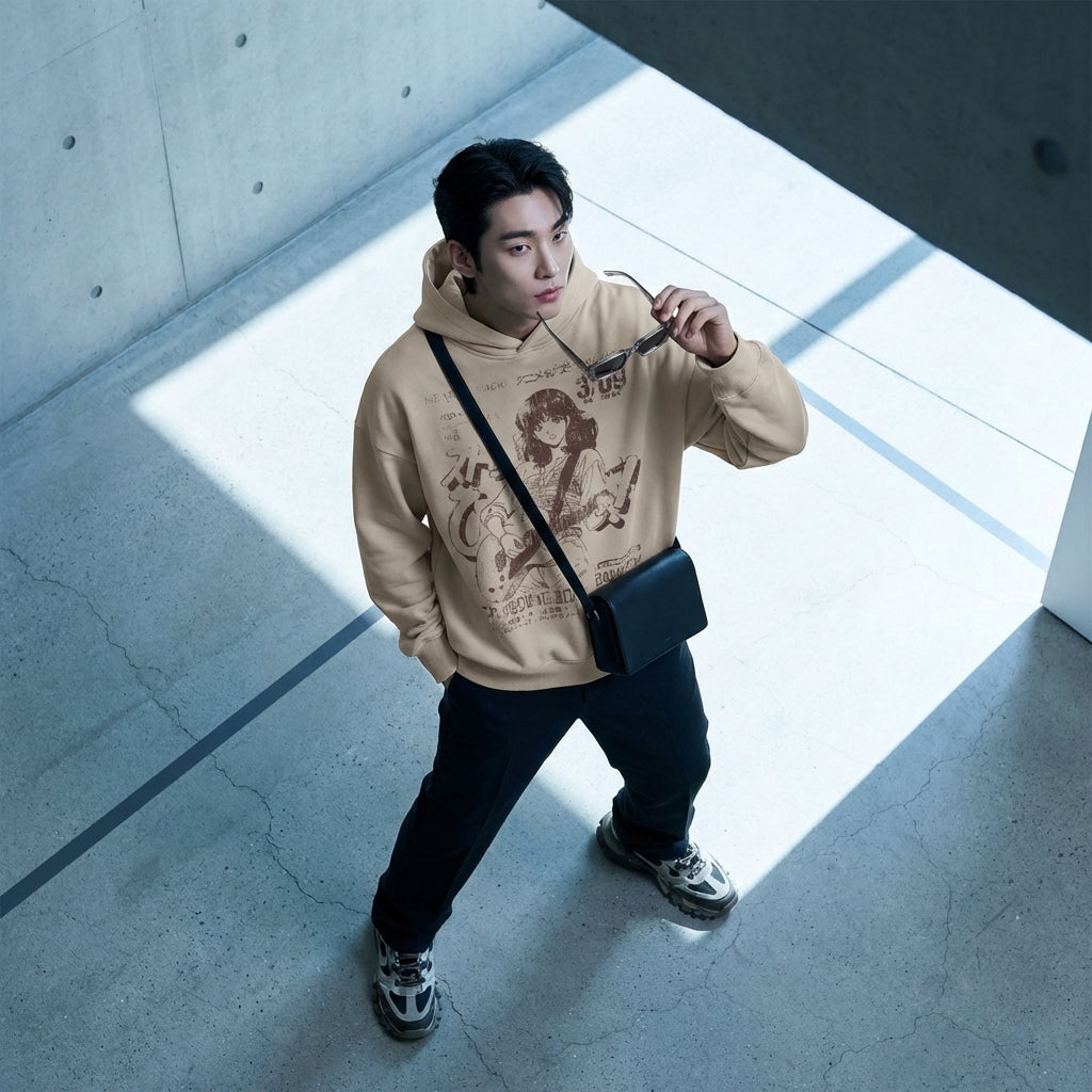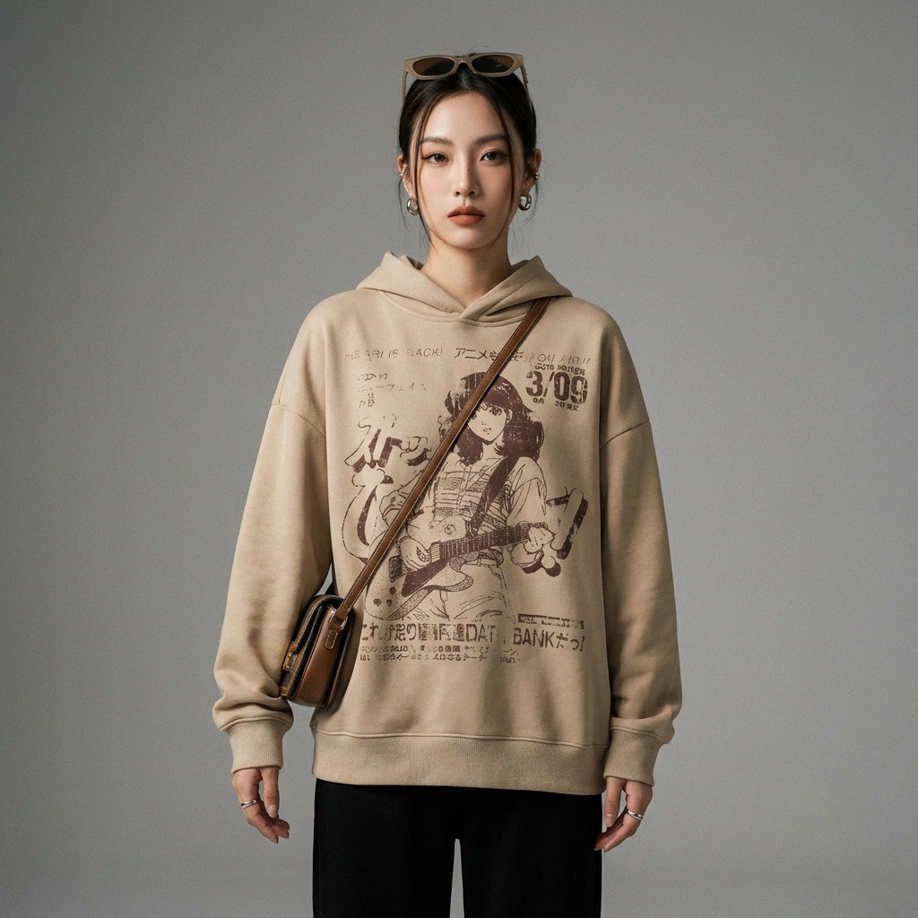 - Estilo: Streetwear, Casual, K-fashion. Esta sudadera con capucha encarna la moda urbana coreana con un toque vintage, perfecta para un look atrevido y cómodo.