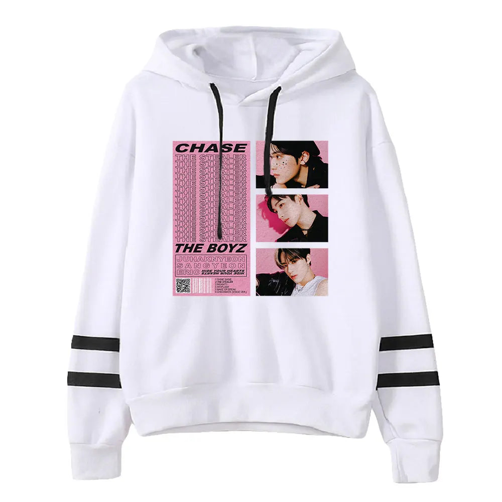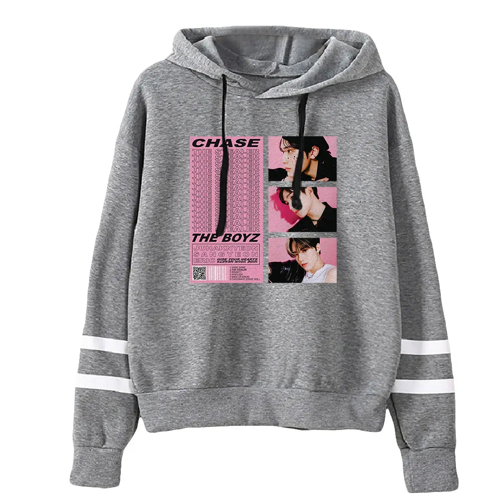 La Sudadera con Capucha 'The Boyz CHASE' es una edición especial dedicada al álbum icónico del grupo. Con un diseño audaz y un enfoque minimalista, esta sudadera con capucha es imprescindible para los fans incondicionales de The Boyz y de la era CHASE.