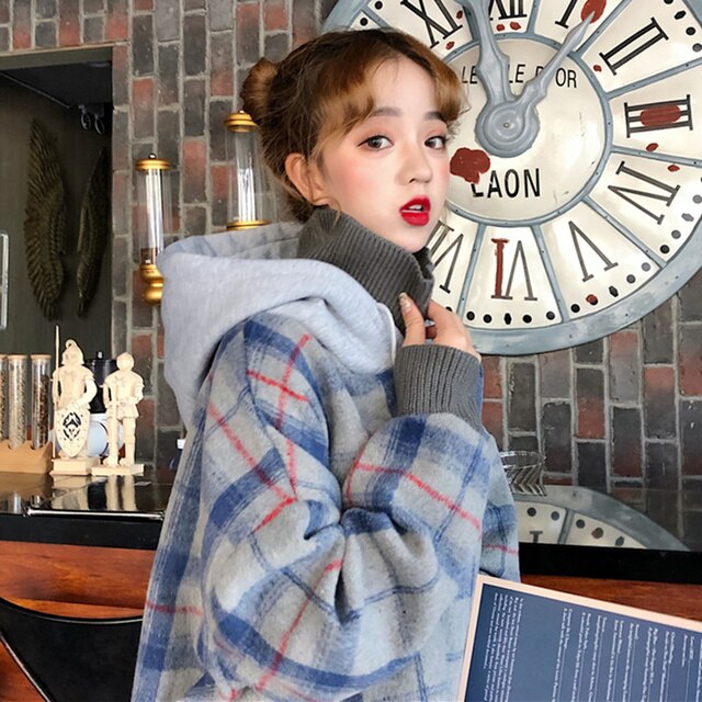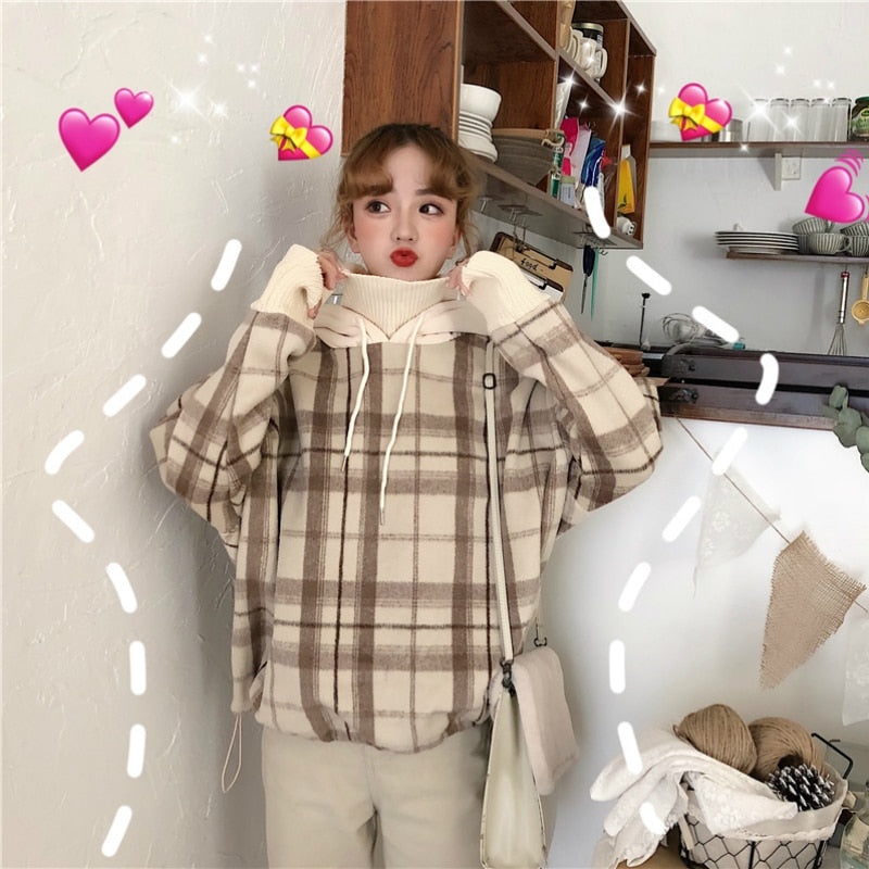 Este jersey con capucha de estilo coreano tiene un cuello alto que es muy popular en Corea del Sur. Es un jersey muy agradable, cálido y suave. Es ideal para las estaciones frías y realza a la persona que lo lleva. Este jersey tiene un estampado de cuadros y un material tipo manta.