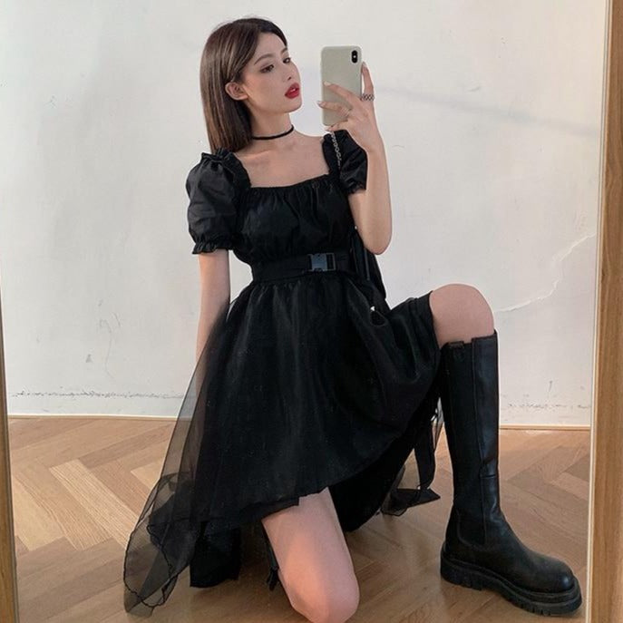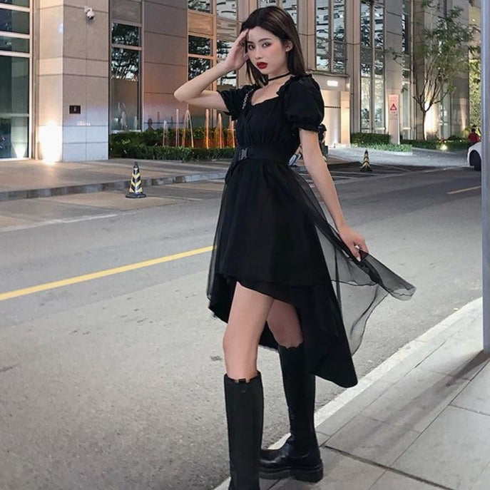 Este vestido gótico está compuesto por varios elementos interesantes. Tiene mangas abullonadas, un cinturón y tela vaporosa. Es un vestido negro que recuerda al estilo gótico y que es muy apreciado en Corea del Sur.
