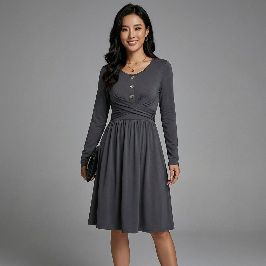 Descubre nuestro vestido midi plisado, una prenda elegante y versátil, perfecta para cualquier ocasión. Su sofisticado diseño con cuello redondo y mangas largas asegura un look chic y cómodo. ¡Ideal para un estilo moderno y refinado! ✨