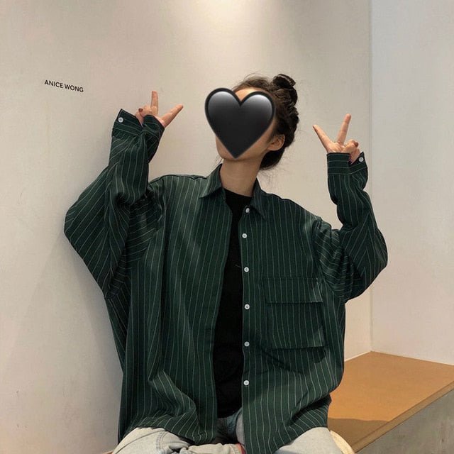 Voici une belle chemise à manches longues avec des rayures verticales. Elle est disponible en trois couleurs. Le vert, le noir et le blanc sont des couleurs représentatives de la mode coréenne en automne. Simple, sobre et élégant.