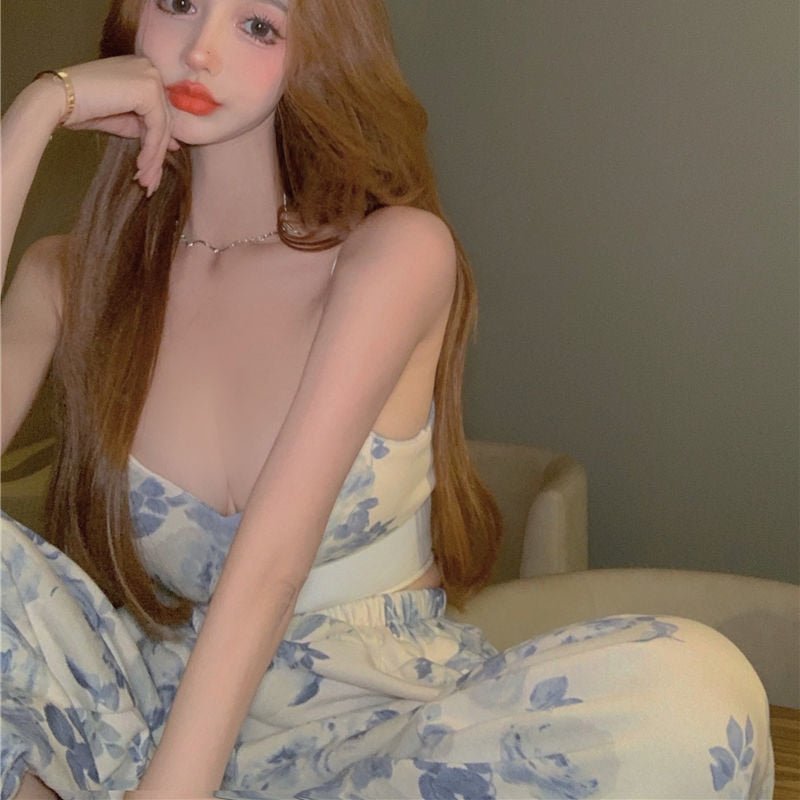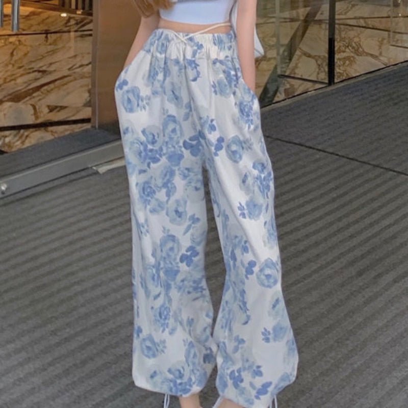 Voici un ensemble avec un jogging large et une brassière crop top. C'est l'ensemble idéal pour faire du sport. Il possède des motifs naturels dont des fleurs bleues et des feuilles.