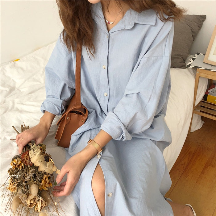 Si vous aimez les chemises grand format, cette robe chemise va vous plaire. C'est une robe avec des boutons et un col de chemise. Elle est disponible en bleue et en blanche. Cette robe est parfaite pour les températures agréables.