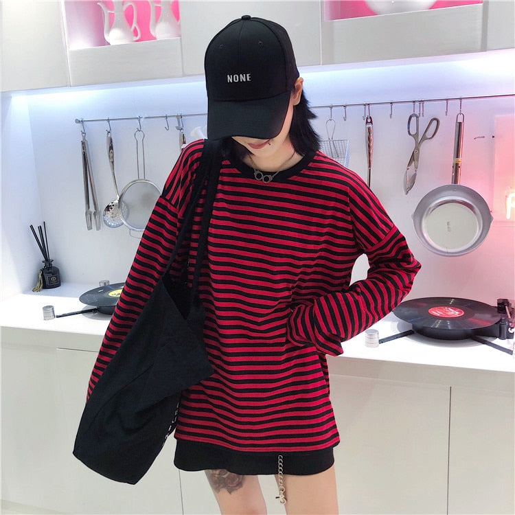 Ce T-Shirt à manches longues est disponible en deux coloris : rayé blanc et noir et rayé noir et rouge pour un style plus rock. Il se porte de manière un peu ample et non près du corps. La particularité de ce modèle striped est que ses manches sont très (Très) longues (elles dépassent les mains). Il est facilement accessoirisable et se porte avec un bas (jupe ou pantalon) uni.
