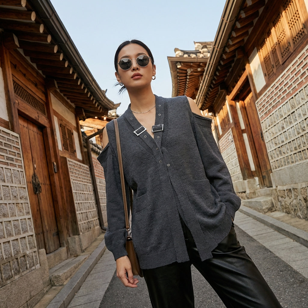 - Style : K-fashion, Tendance, Décontracté, Minimaliste. Ce cardigan incarne l'élégance discrète et moderne de la mode coréenne.