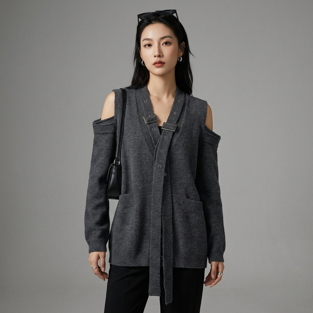 Adoptez une allure tendance et décontractée avec notre cardigan tricoté à col V, doté d'une coupe à épaule dénudée pour une touche de modernité. Ce haut gris à manches longues, orné de détails métalliques discrets, est parfait pour un style à la fois chic et confortable ! ✨