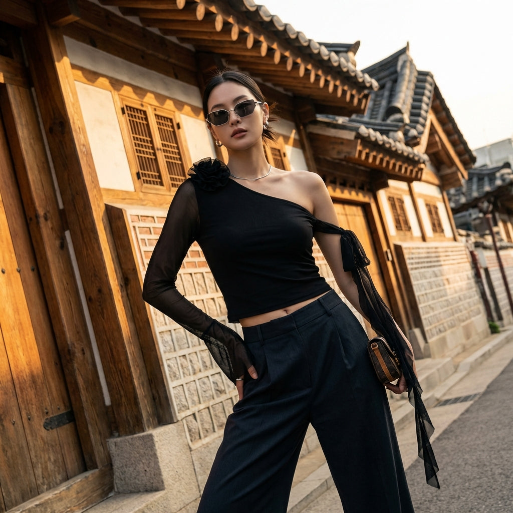 • Style : K-fashion, Tendance, Urbain. Ce top incarne l'esprit audacieux et contemporain de la mode coréenne, idéal pour celles qui aiment se démarquer.