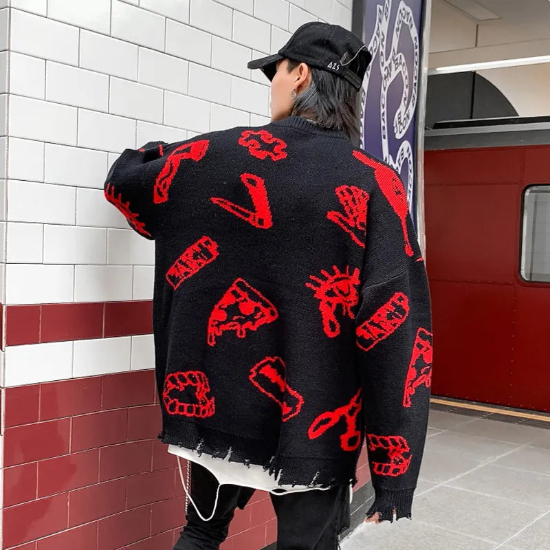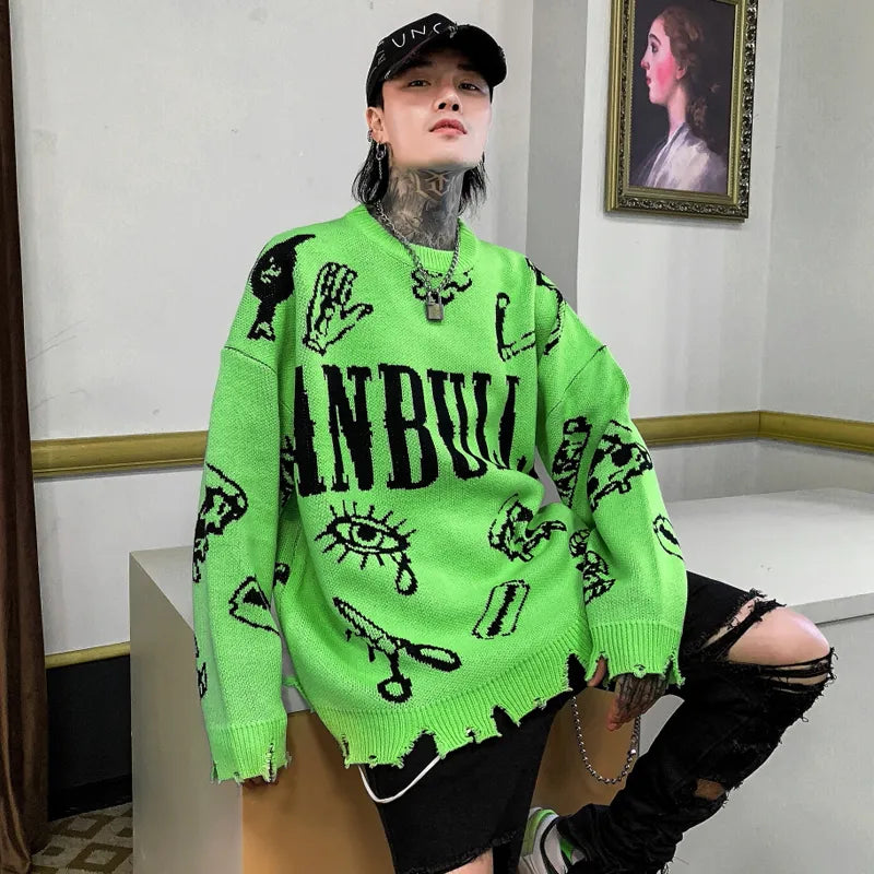 Style : Punk Hip-Hop. Avec des déchirures audacieuses et un design graffiti, ce pull incarne un esprit jeune et rebelle.
