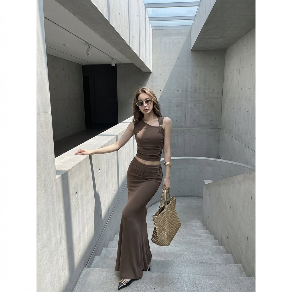 Affirmez votre style avec cet ensemble moderne et élégant, composé d'un top asymétrique à épaule dénudée et d'une jupe longue plissée qui épouse parfaitement les hanches. Un look audacieux pour celles qui osent se démarquer ! ✨