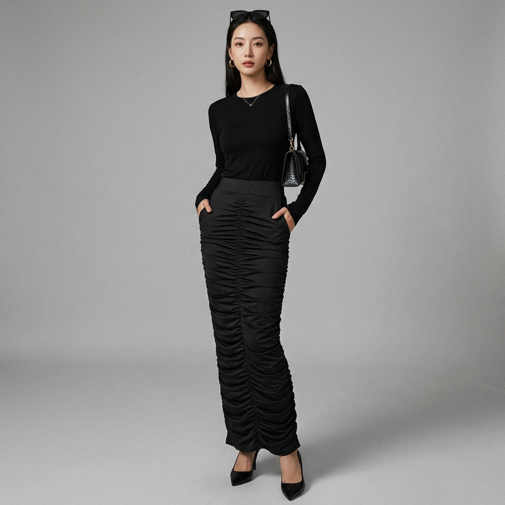 Jupe longue plissée taille haute noire - Mode Coréenne Élégante Koreanxwear