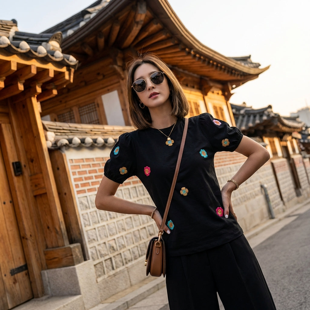 Ce T-shirt brodé est un ajout essentiel à votre garde-robe d'été, alliant style, confort et une touche de raffinement coréen.
