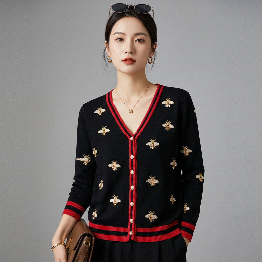 Adoptez le style décontracté et raffiné avec notre cardigan en maille légère. Idéal pour les journées plus fraîches, il est orné d'une délicate broderie d'abeille et d'une coupe ample qui en fait la pièce parfaite pour un look superposé. Un essentiel pour une touche de douceur dans votre garde-robe ! 🐝