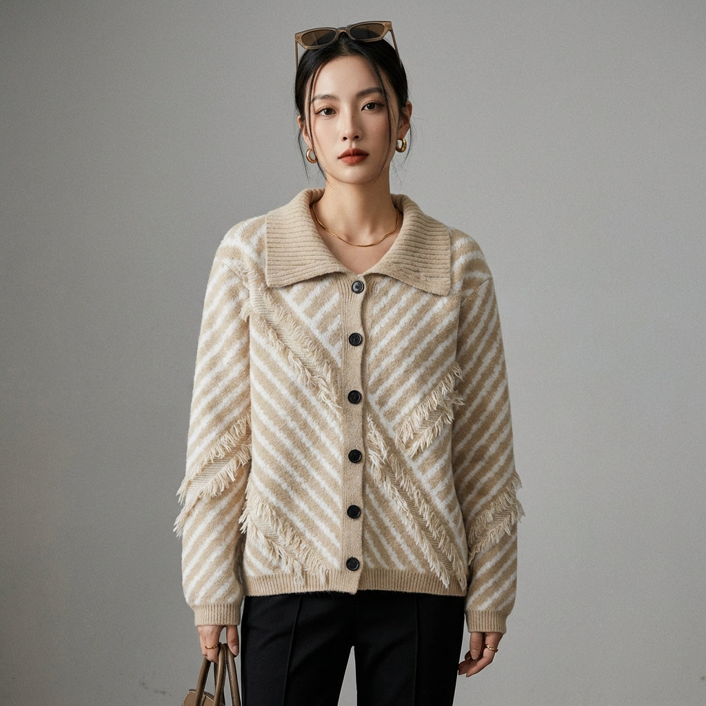 Adoptez un look décontracté et chic avec notre cardigan tricoté à col polo, orné de rayures contrastantes et d'un design ample. Ce pull, fermé par un bouton unique, est parfait pour ajouter une touche de style K-fashion à votre garde-robe. Idéal pour un confort et une élégance au quotidien ! ✨