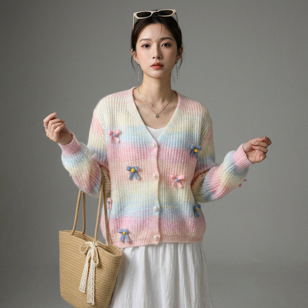 Cardigan rayé arc-en-ciel ample avec nœud - Koreanxwear