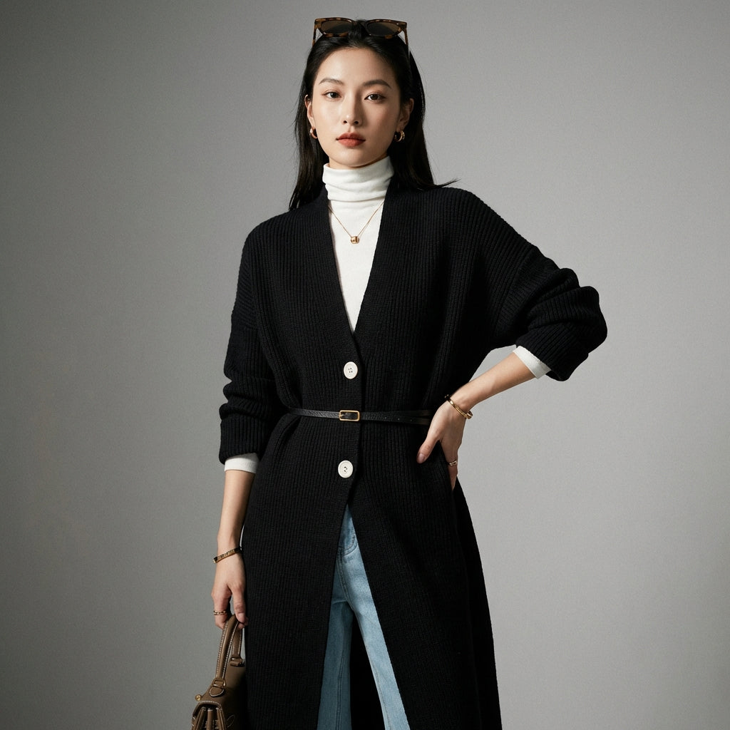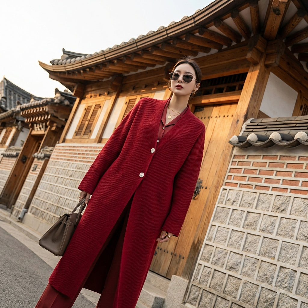 • Style : Élégant, Minimaliste, K-fashion. Ce cardigan incarne l'élégance discrète et les lignes épurées de la mode coréenne, parfait pour un look chic et tendance.