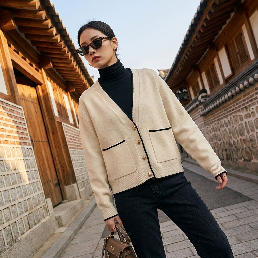 - Style : Mode coréenne, Casual, Minimaliste. Ce cardigan incarne l'élégance simple et la décontraction, très prisées dans la K-fashion.