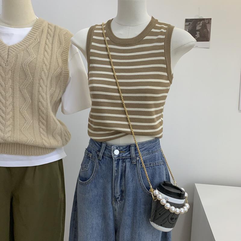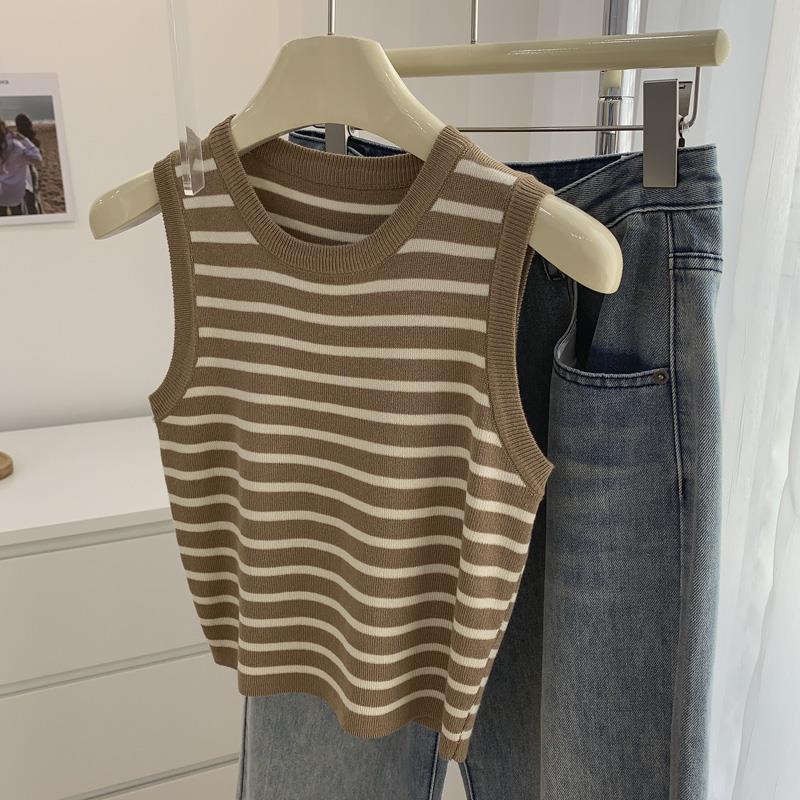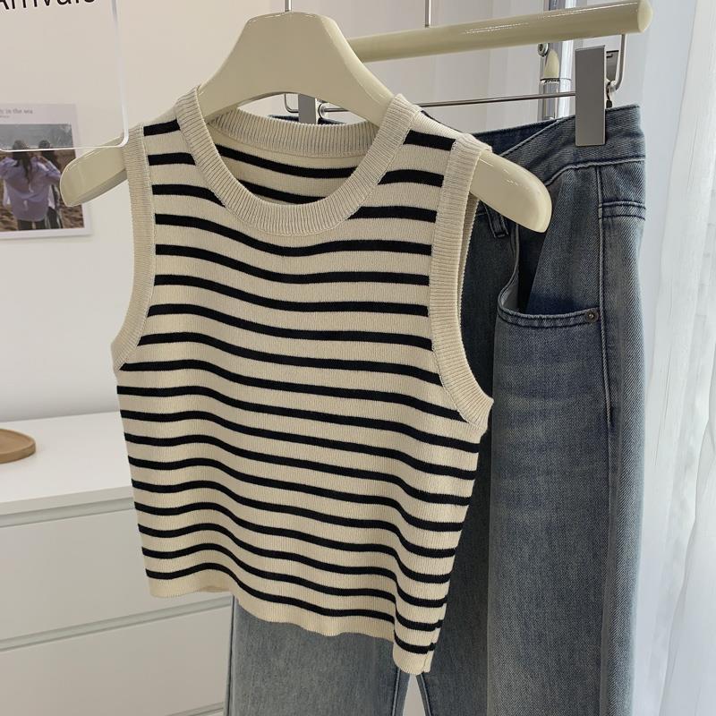 Adoptez le charme d'un débardeur en maille rayée, inspiré par la mode coréenne, et conçu pour sublimer votre silhouette cet été. Ce haut sans manches combine élégance et confort, grâce à son tissu en fibres de viscose et polyamide, idéal pour les beaux jours. ☀️