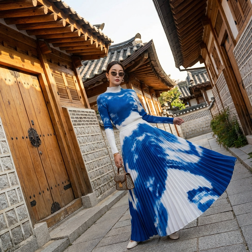 Ensemble plissé bleu col montant et jupe longue - Mode coréenne femme - Taille 78cm skirt set