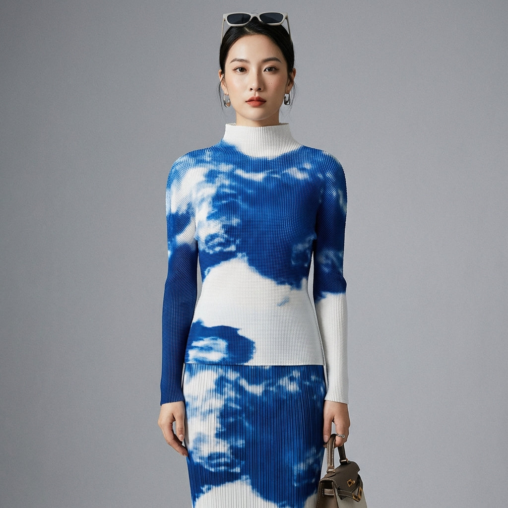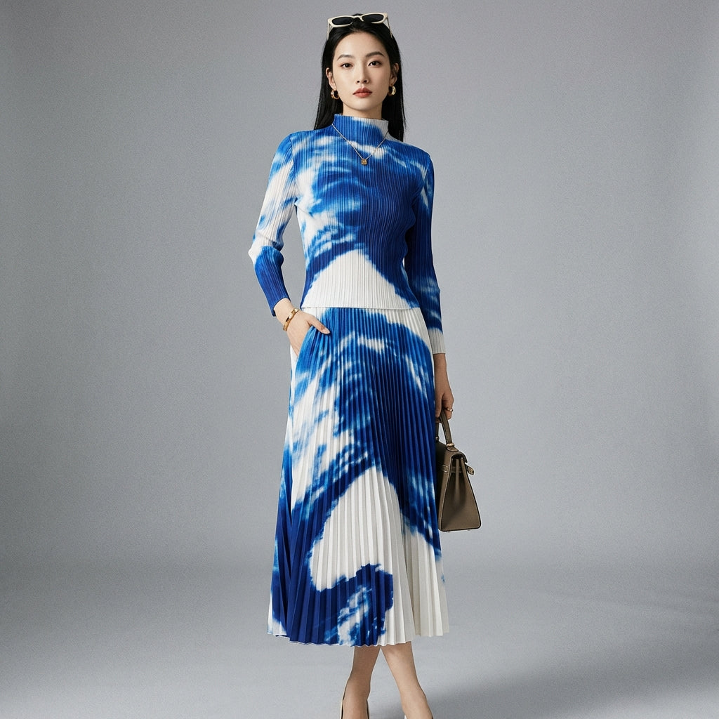 Ensemble plissé bleu col montant et jupe longue - Mode coréenne femme - Taille One size top