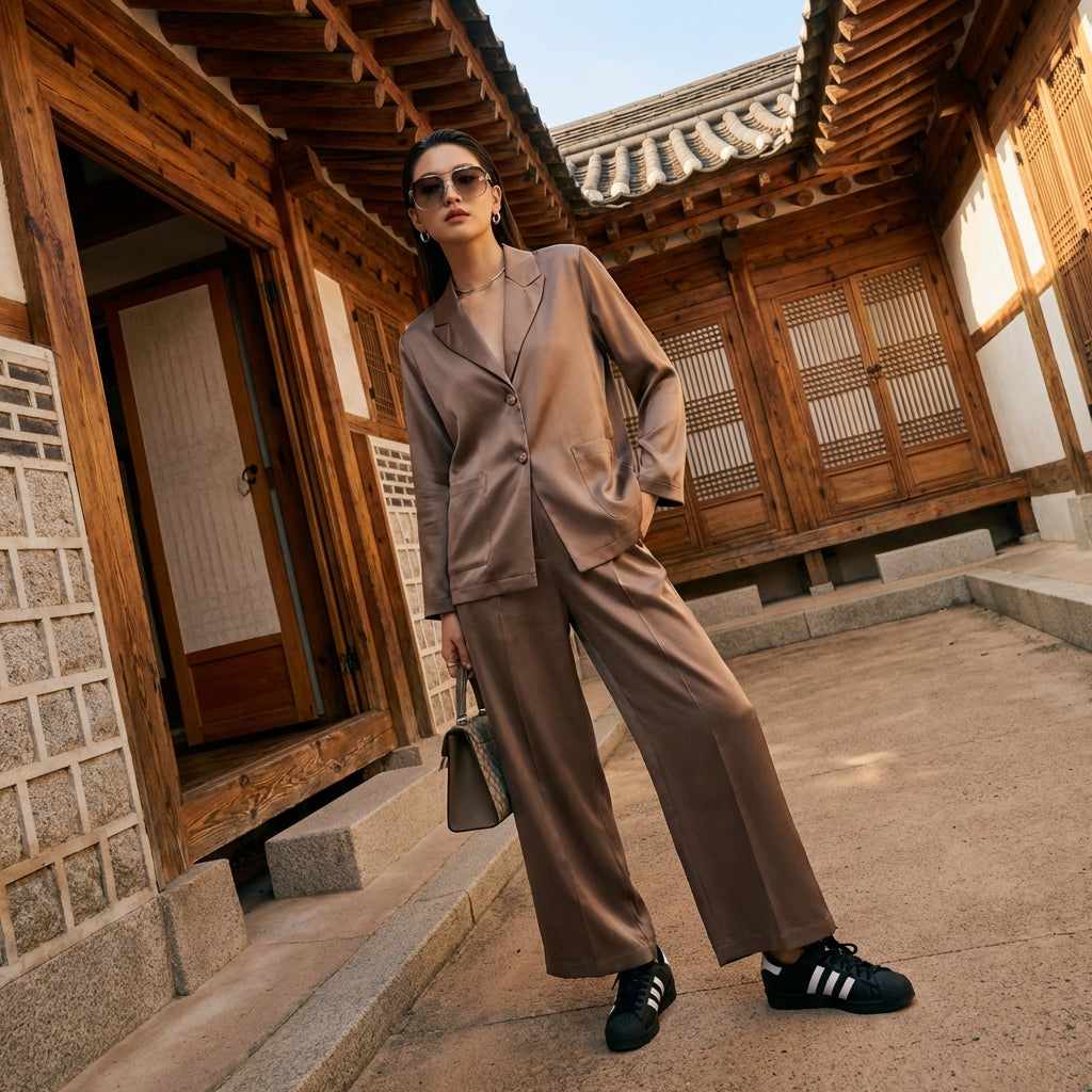 - Style : K-fashion, Élégant, Décontracté, British. Cet ensemble incarne la fusion parfaite entre l'élégance britannique classique et les tendances décontractées de la mode coréenne, pour un style polyvalent et chic.