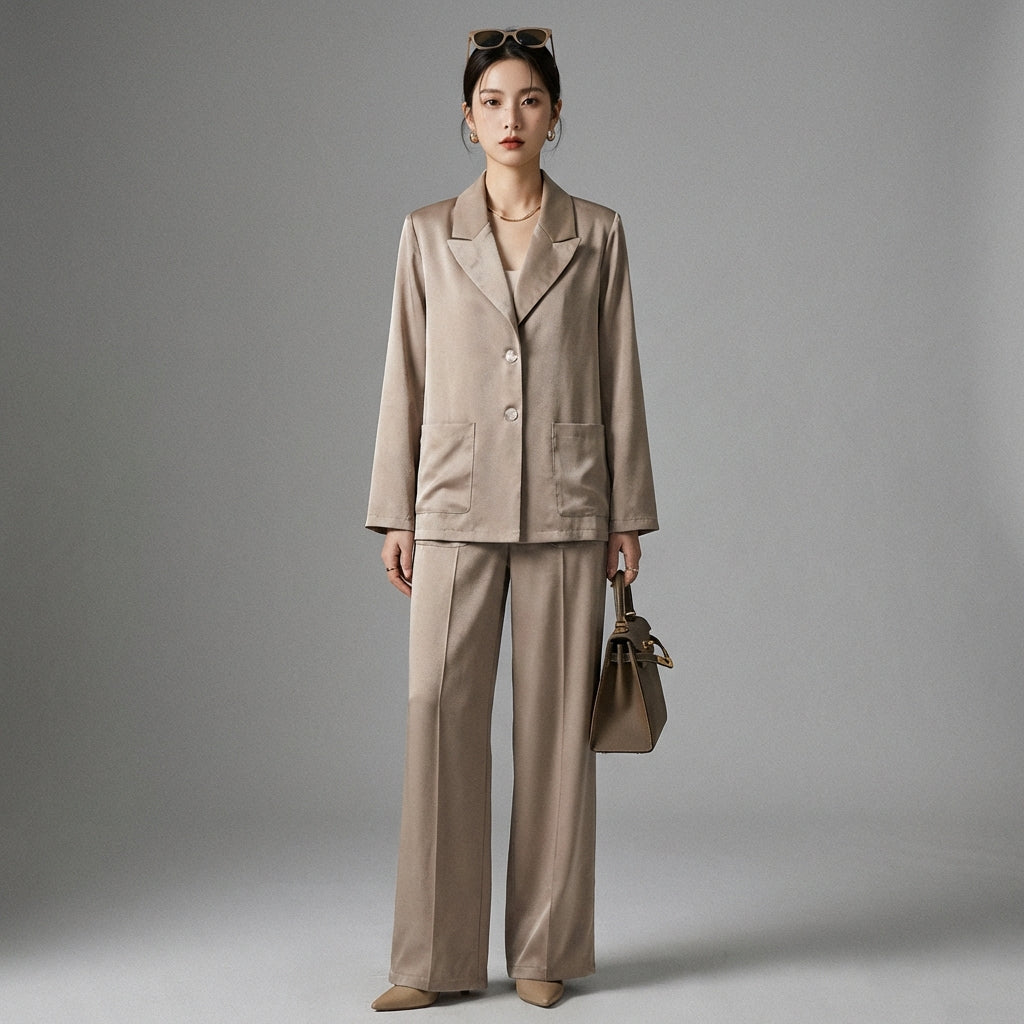 Cet ensemble tailleur est la pièce maîtresse pour une garde-robe chic et fonctionnelle, vous permettant de passer sans effort du bureau aux sorties décontractées avec une touche d'élégance contemporaine.