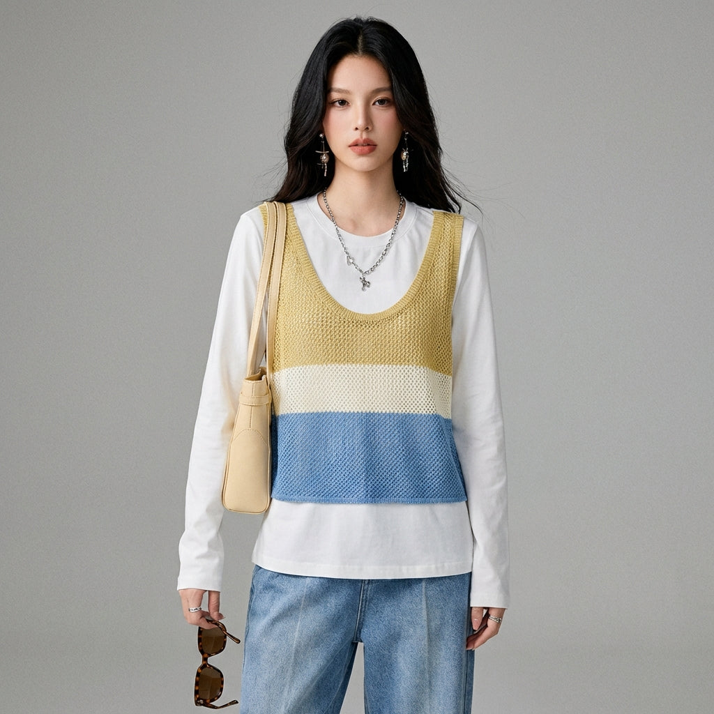 Adoptez un look frais et tendance avec notre haut tricoté bicolore, doté d'un col rond et de manches longues. Son design unique simule un effet "deux pièces" pour une allure moderne et sophistiquée. Parfait pour ajouter une touche d'originalité à votre garde-robe décontractée ! ✨