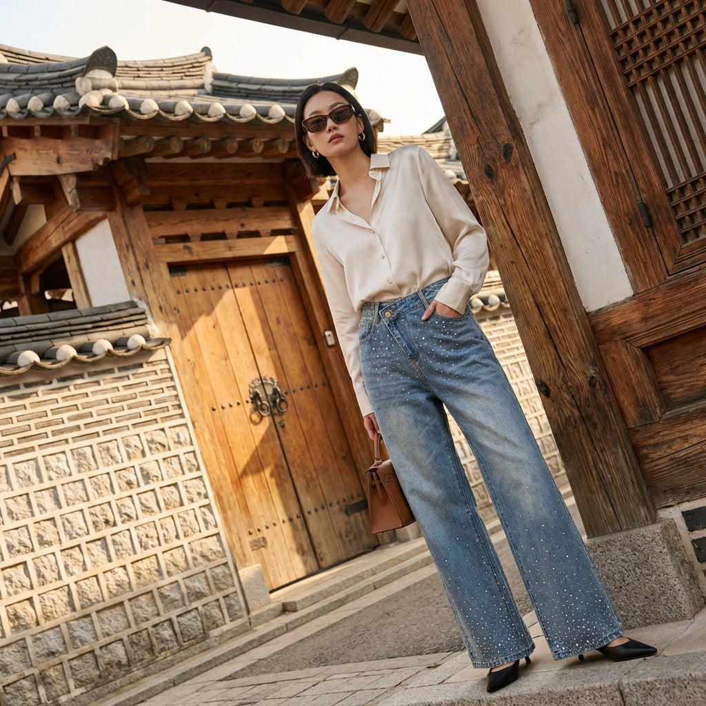 Jean droit vintage bleu pour un look streetwear décontracté K-fashion