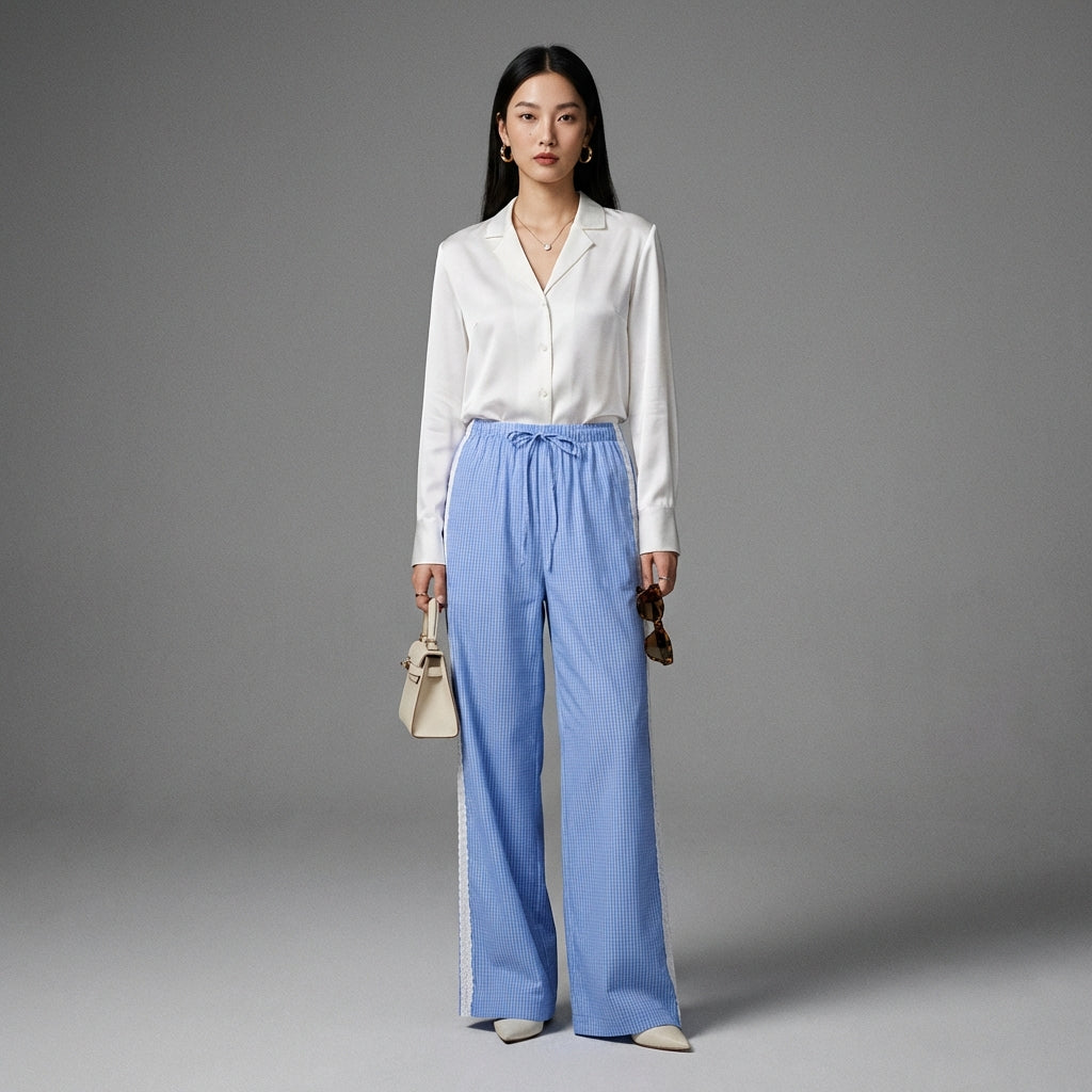Adoptez un look décontracté et chic avec notre pantalon large taille élastique, agrémenté de délicates incrustations de dentelle bleue. Conçu pour le confort et le style, il vous accompagnera parfaitement au quotidien ! 💙