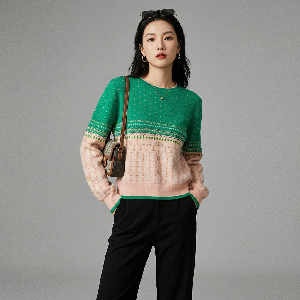 Pull court tricoté jacquard color block femme - Koreanxwear