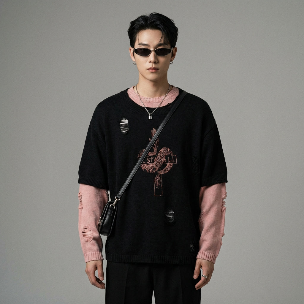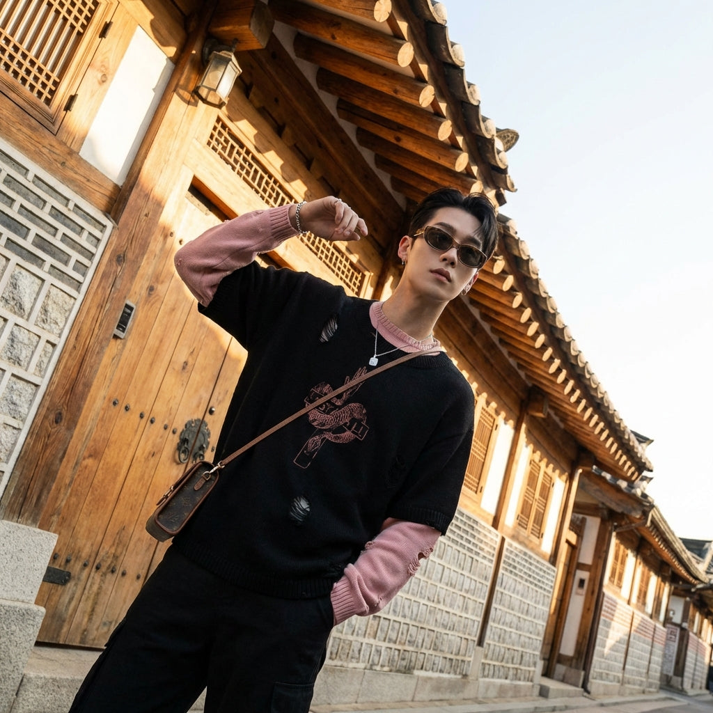 - Style : Streetwear, Rétro, K-fashion. Ce pull incarne le style urbain coréen avec ses détails déchirés et sa coupe ample, parfait pour un look décontracté et branché.