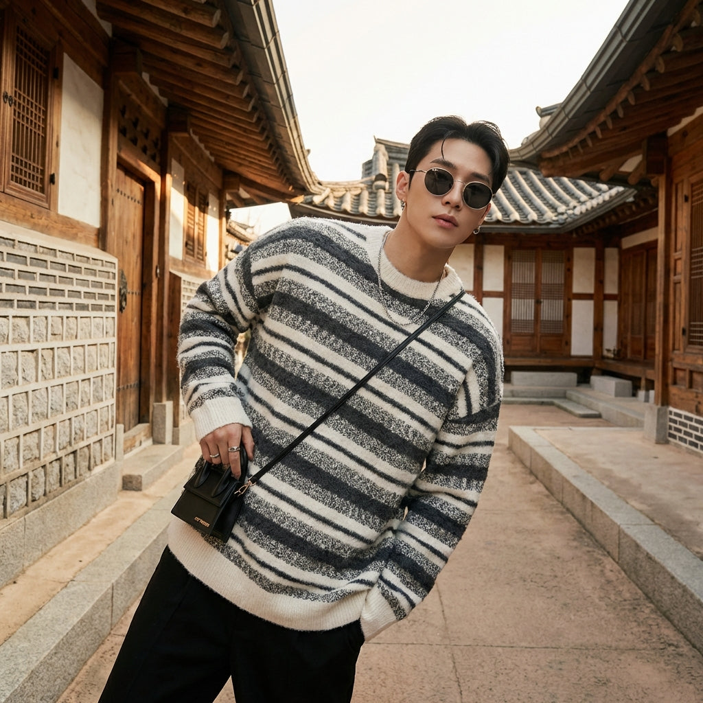 Ce pull rayé est un incontournable pour ceux qui cherchent à allier confort, style et les dernières tendances de la mode coréenne.