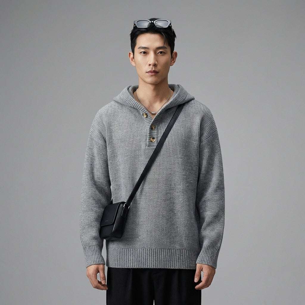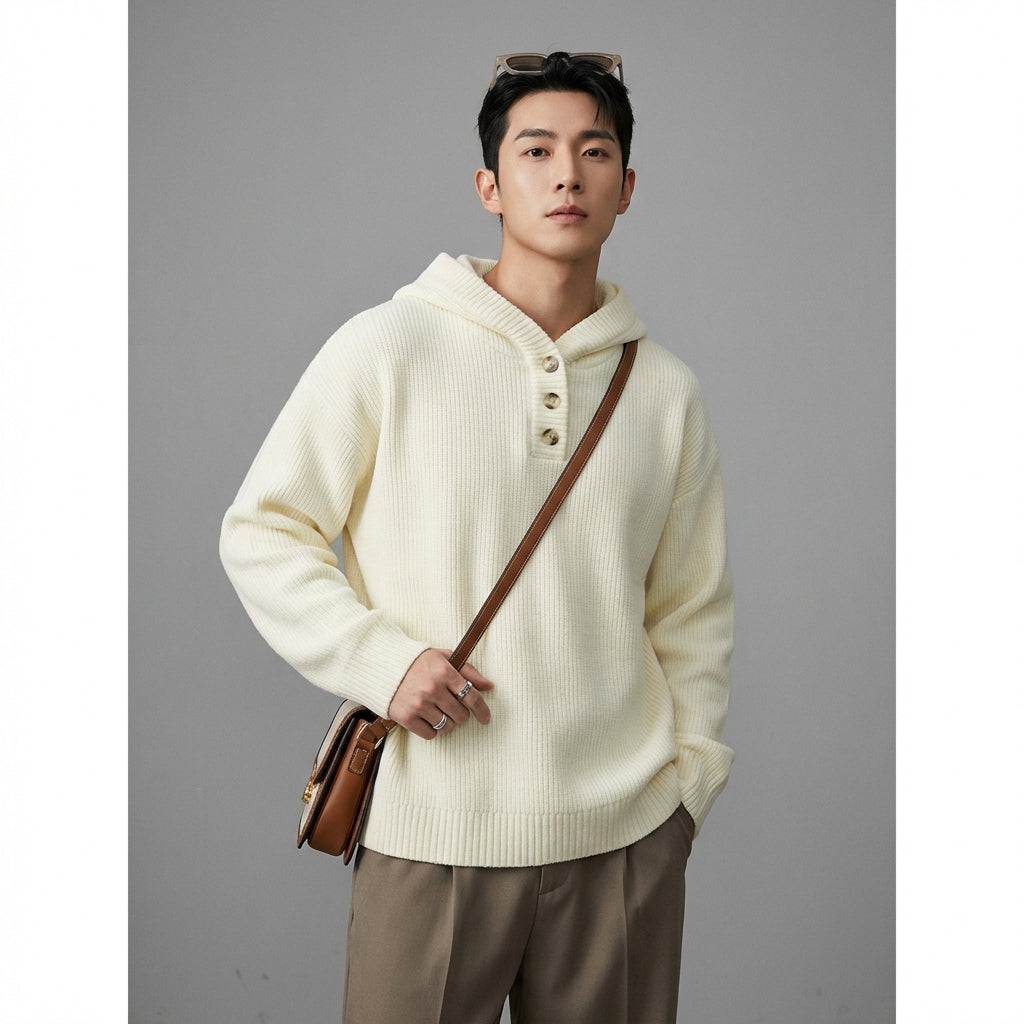 Adoptez un look décontracté et tendance avec notre pull tricoté à capuche, doté d'un design color-block et d'une fermeture à demi-boutons. Sa coupe ample et son traitement anti-plis en font un incontournable pour un style confortable et moderne ! ✨