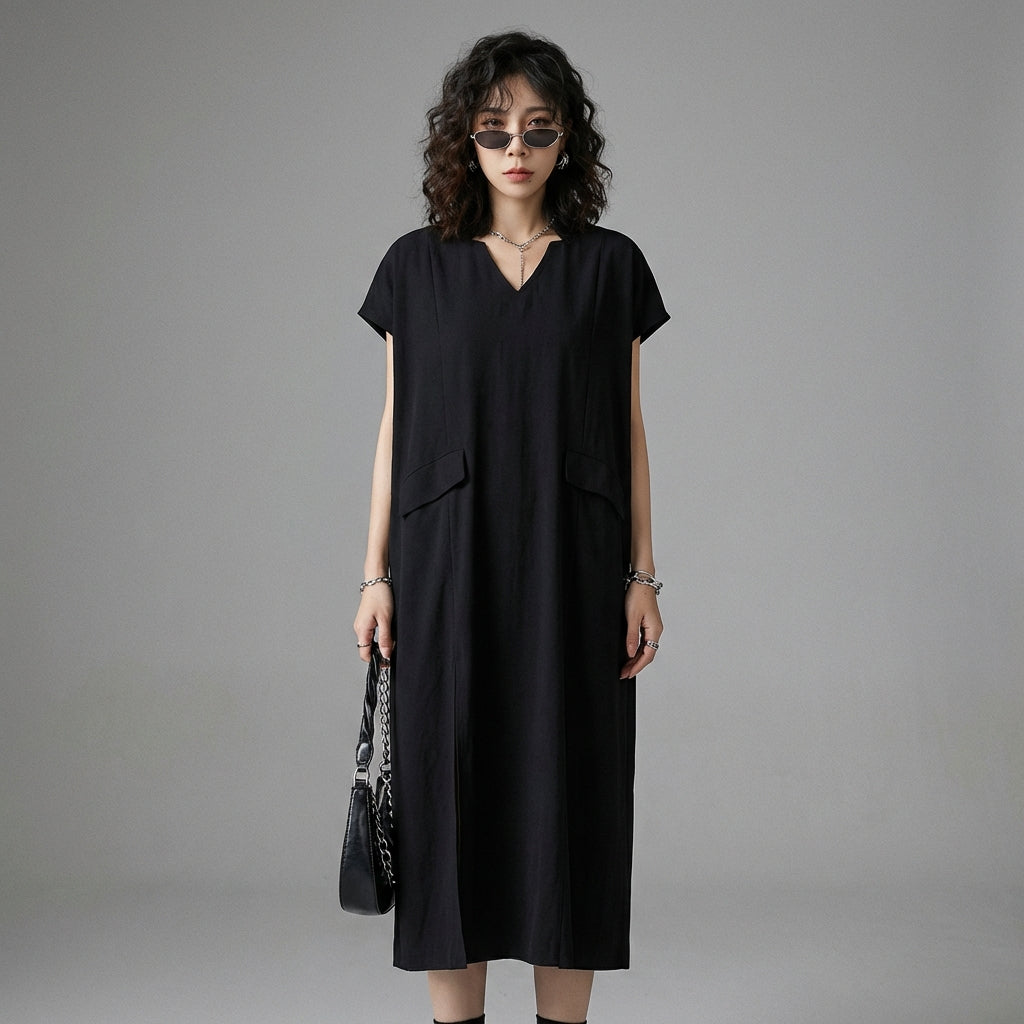 Adoptez un look chic et décontracté avec notre robe midi à col V, dotée de manches courtes et d'une coupe ample. Son design plissé asymétrique et sa fente subtile ajoutent une touche d'originalité et d'élégance à votre garde-robe. Parfaite pour toutes les occasions, cette robe allie confort et style avec brio ! 💃