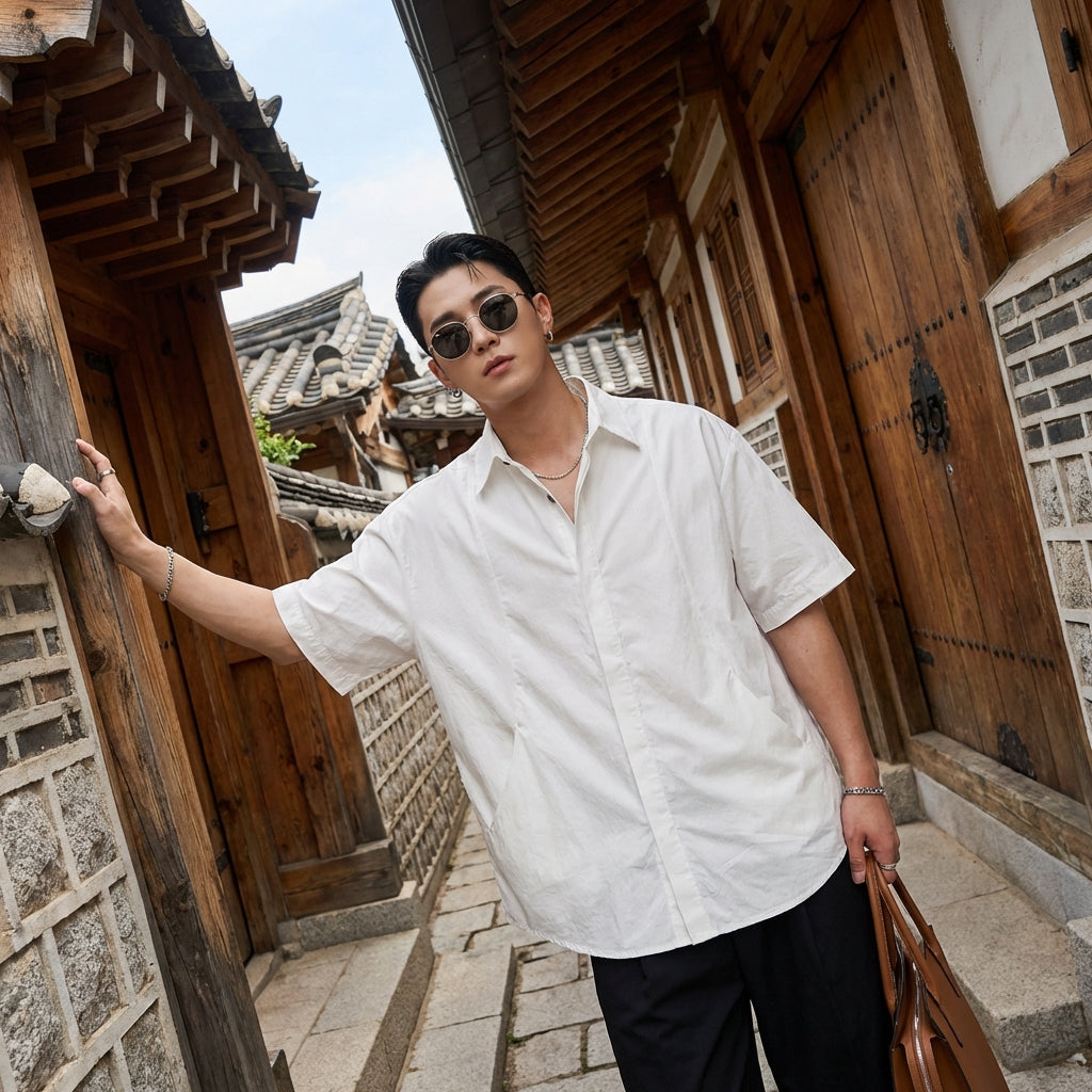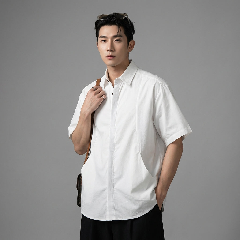 Solid color structure curved pressed line pocket loose short sleeved shirt