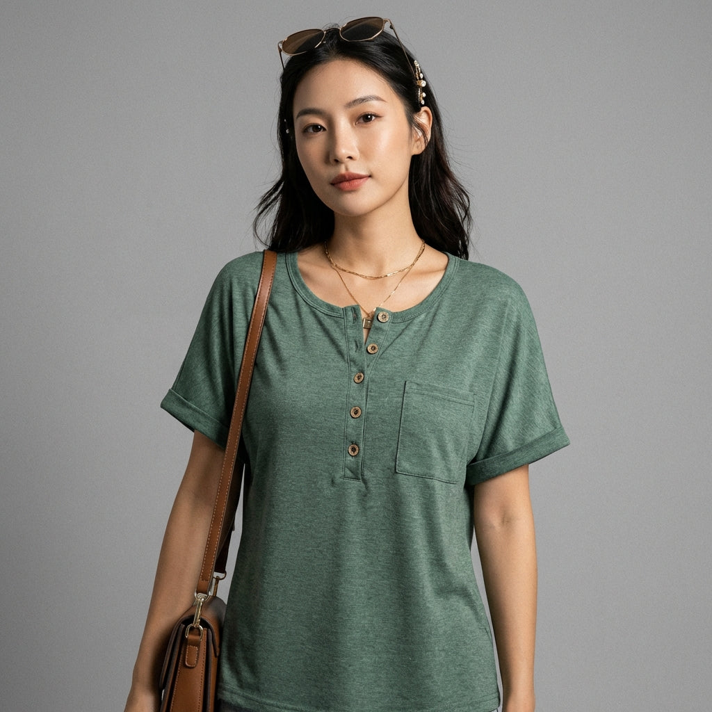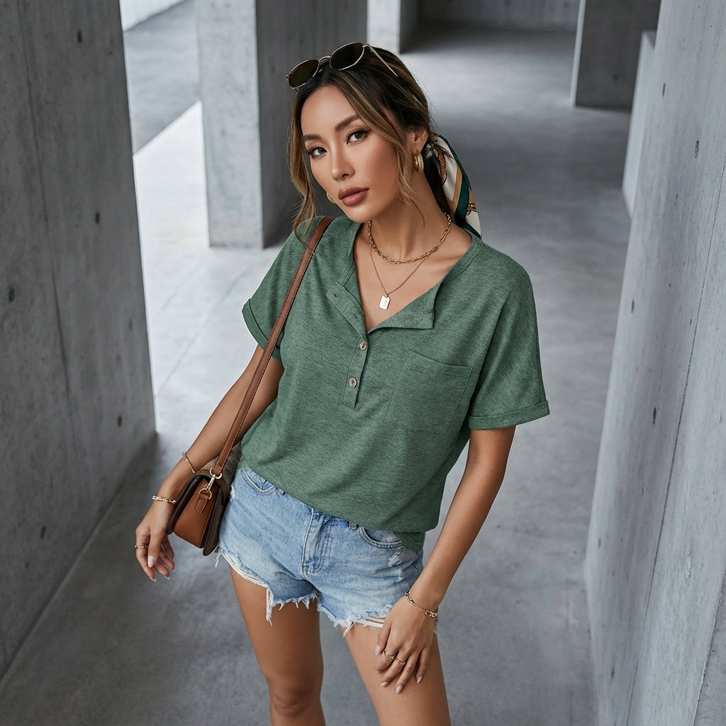 Adoptez un look décontracté et stylé avec notre T-shirt à manches courtes et col rond, doté de demi-boutons et de poches discrètes. Sa coupe ample assure un confort optimal pour toutes vos activités quotidiennes ! 🌿