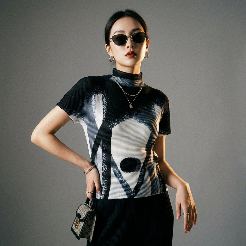 Affirmez votre style avec notre t-shirt à col montant et manches courtes, sublimé par un imprimé géométrique audacieux. Sa coupe ajustée mettra en valeur votre silhouette, parfaite pour un look estival et tendance ! ☀️