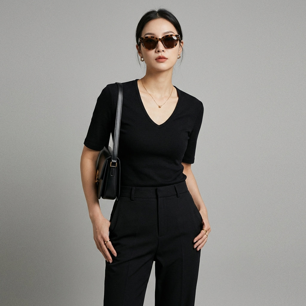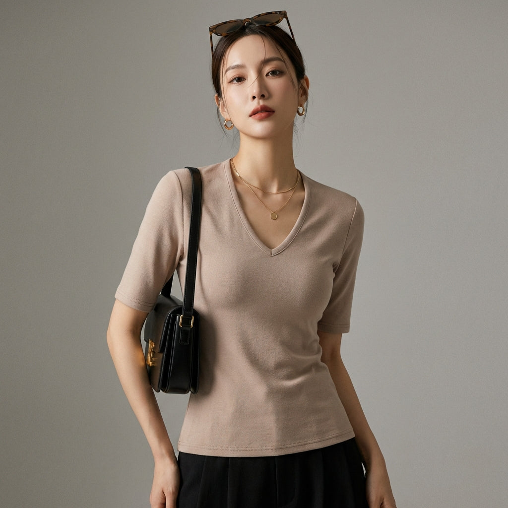 Adoptez un look chic et épuré avec notre T-shirt ajusté à col V et manches courtes. Idéal pour mettre en valeur votre silhouette, il combine style et confort pour toutes vos occasions ! ✨