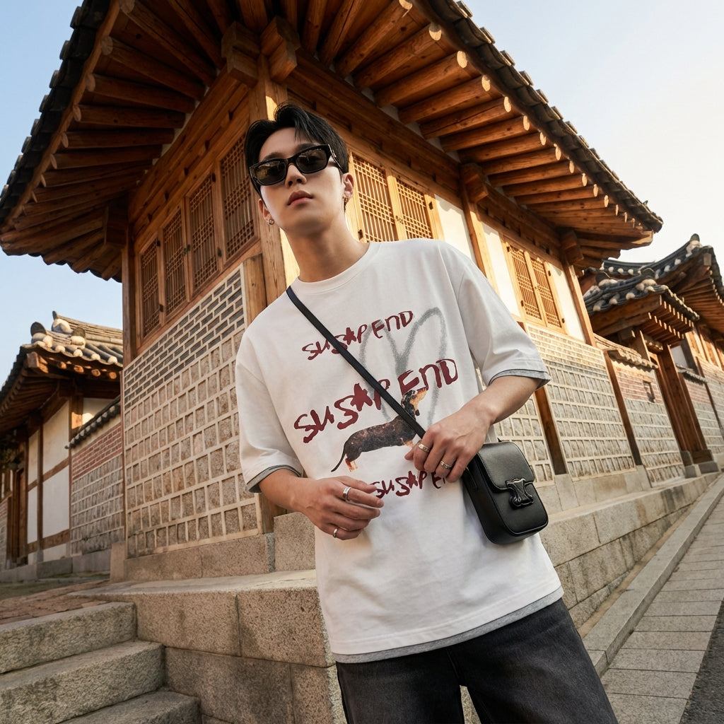 - Style : American Retro, Streetwear, Casual. Ce t-shirt combine un esprit vintage américain avec une coupe moderne et décontractée, très prisée dans la K-fashion.