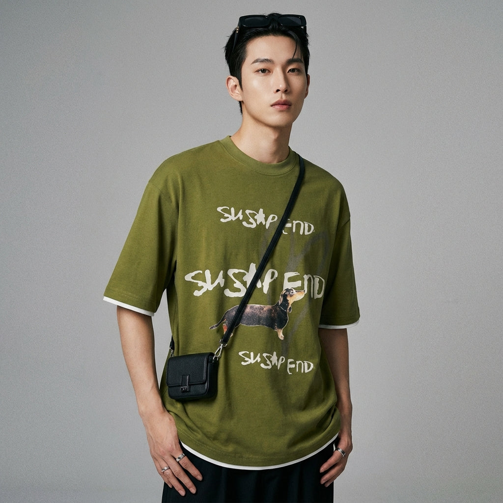Adoptez un look décontracté et tendance avec notre T-shirt effet "deux pièces" imprimé d'un adorable chien saucisse. Son design ample et confortable en fait un essentiel pour toutes les occasions décontractées. Idéal pour un style American Retro avec une touche d'originalité ! 🐾