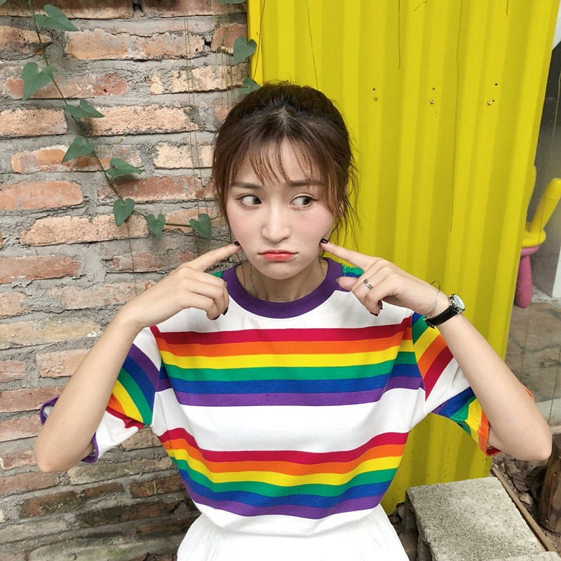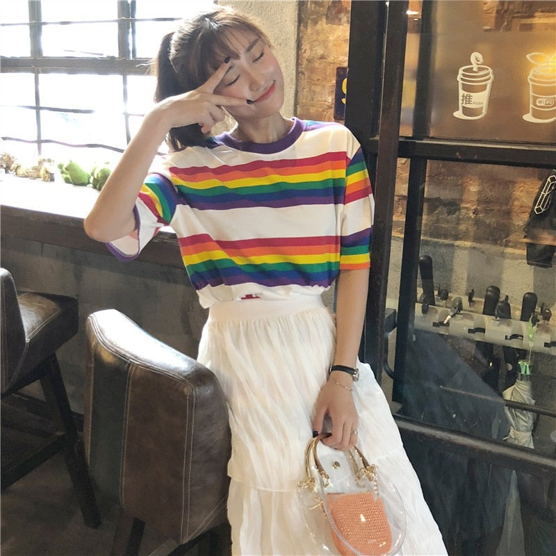 Rayonnez avec style grâce à notre T-shirt coréen à rayures arc-en-ciel, une pièce parfaite pour ajouter une touche de couleur à votre tenue estivale. Son design décontracté et ses manches demi-longueur offrent confort et élégance pour toutes vos activités quotidiennes ! 🌈