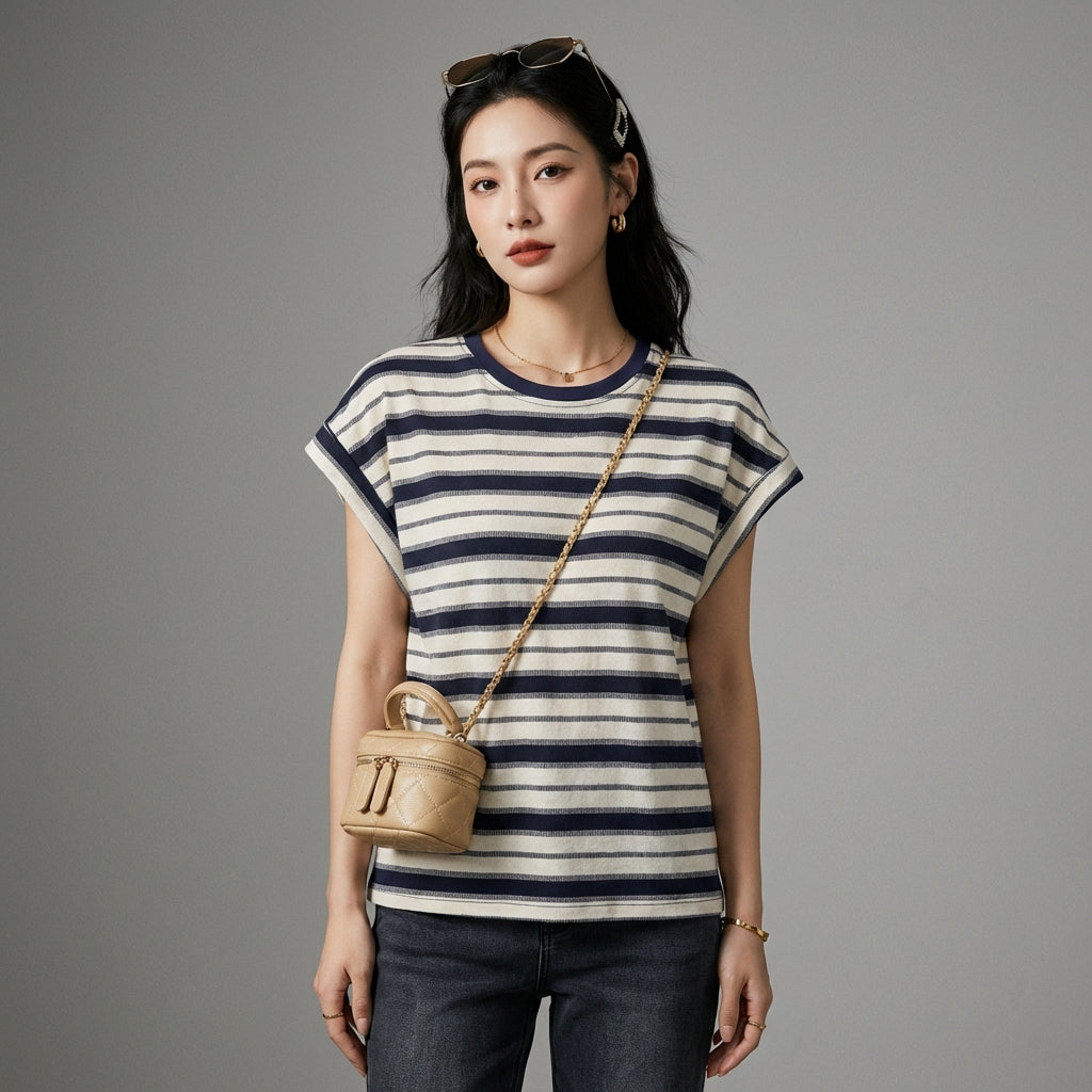 Adoptez un look frais et moderne avec notre T-Shirt à rayures color block et manches volantes. Sa coupe décontractée et son design tendance en font un incontournable pour un style élégant et confortable ! ☀️